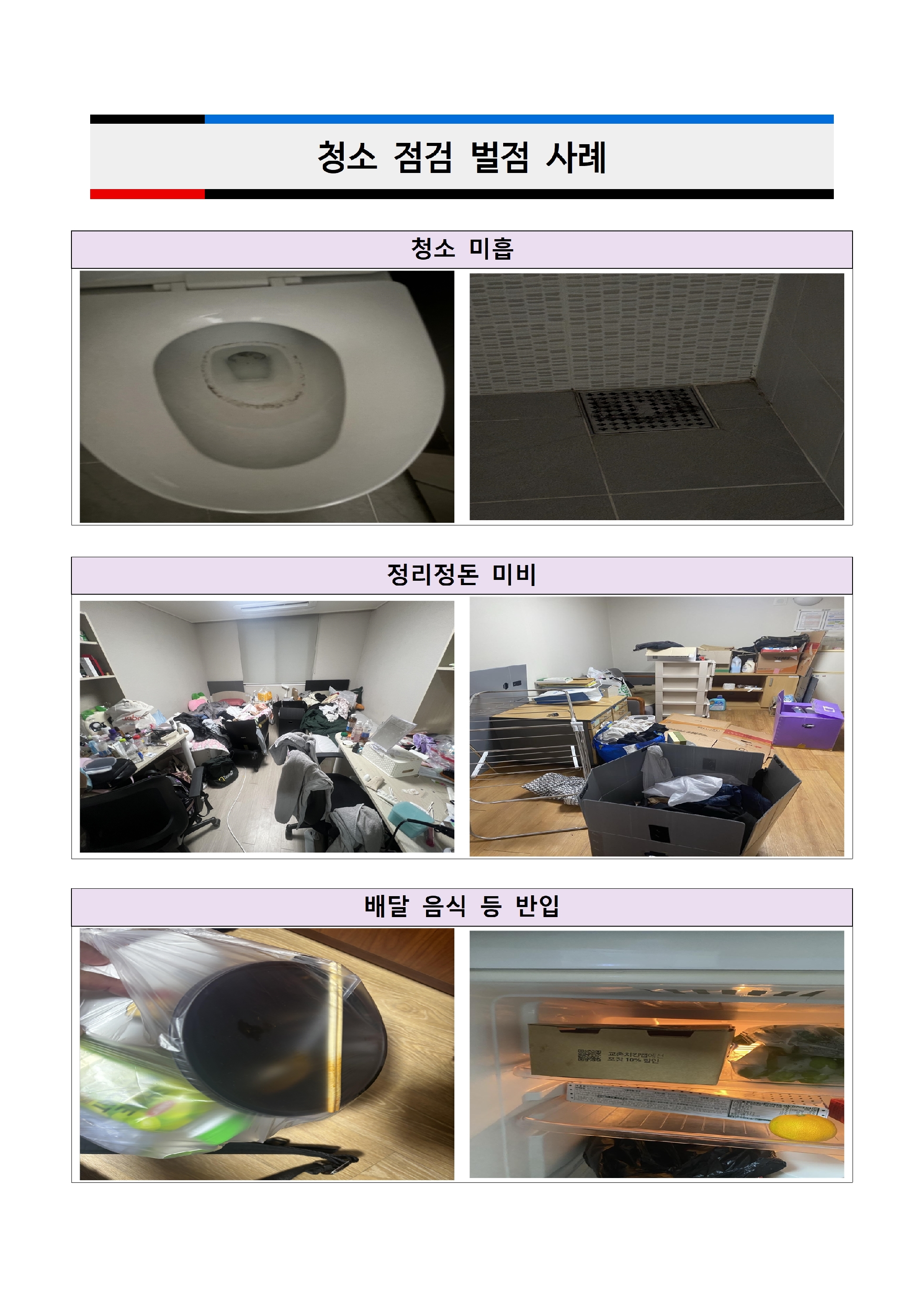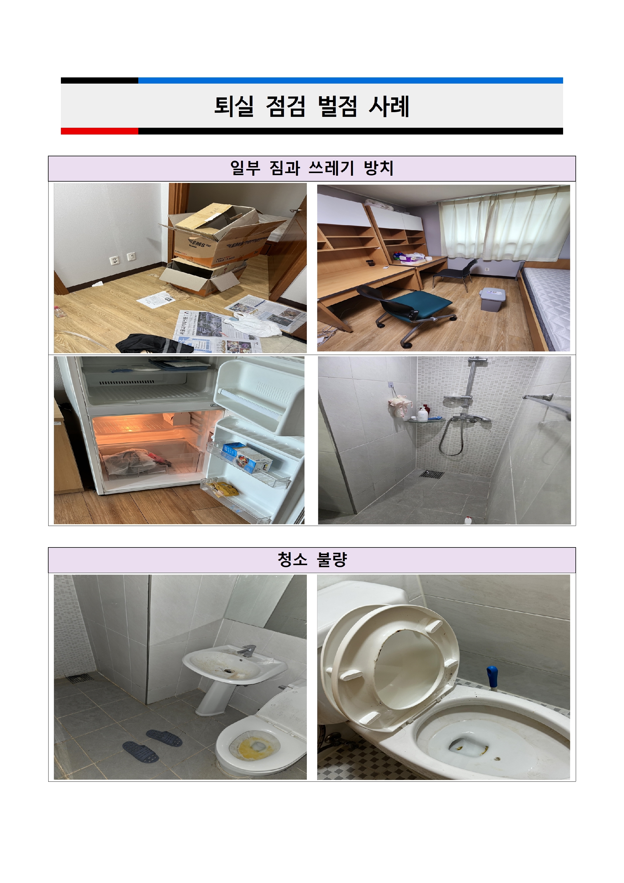생활관 청소 점검 및 퇴실 점검 불량 (벌점 부여) 사례 안내