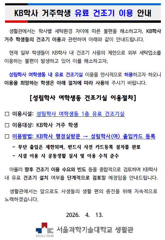 현재 일부 학생들이 KB학사 내 건조기 사용의 제한으로 외부 세탁업소를 이용하는 불편이 발생하고 있어 이를 해소하고자, 성림학사 여학생동 내 유료 건조기실 이용을 한시적으로 허용하고자 하오니 이용을 희망하는 학생은 아래 절차에 따라 사용해 주시기 바랍니다.