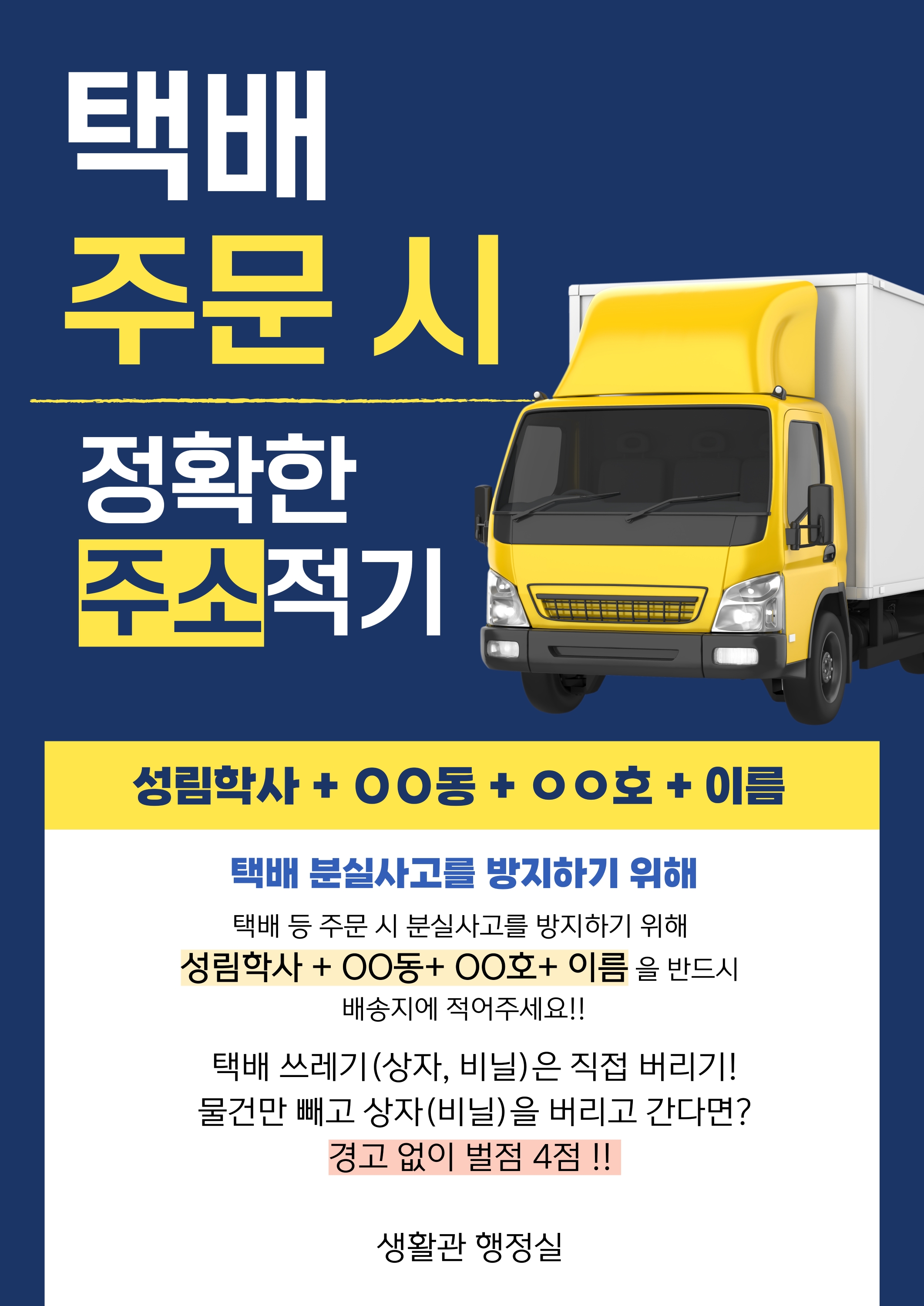 안녕하세요, 성림학사 행정실입니다 택배 분실 사고를 예방하고 사생 여러분의 소중한 물품이 제자리에 잘 전달될 수 있도록, 택배 주문 시 배송지를 아래와 같이 기재해 주시길 부탁드립니다.
